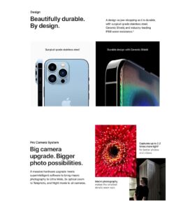 - Pro camera system with new 12MP Telephoto, Wide, and Ultra Wide cameras; LiDAR Scanner; 6x optical zoom range; macro photography; Photographic Styles, ProRes video, Smart HDR 4, Night mode, Apple ProRAW, 4K Dolby Vision HDR recording